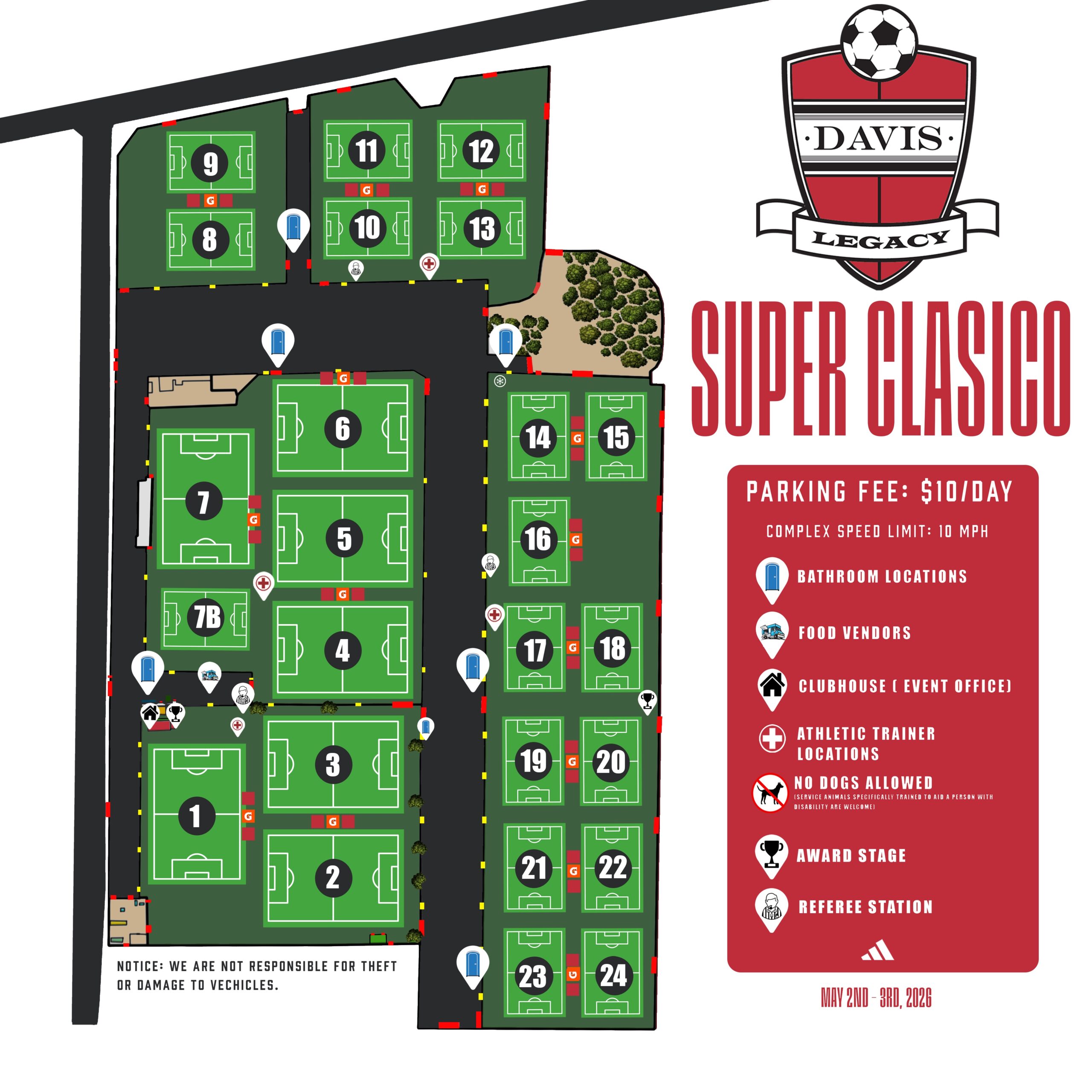16 field complex with some of the nicest playing surfaces in the country. Over 1000 clubs participate in our Davis Legacy Tournament Series each year.